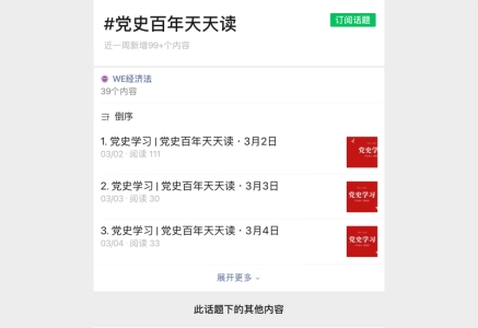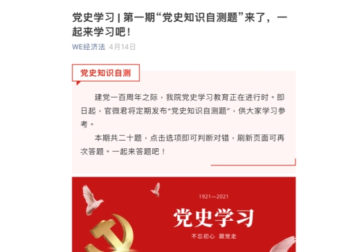 2021年3月2日起,公司公众号推出系列推送【党史学习|党史百年天天读】栏目,每天更新党史学习资料,截至目前已连续推出文章65篇。该栏目内容转自公众号共产党员,在“重要论述”“党史回眸”“历史瞬间”三大板块中图文并茂地分享了重要讲话精神、历史节点等多项内容。自4月14日公司公众号还推出了“党史知识自测题”,供全院师生学习参考,为迎接中国共产党百年华诞、回顾党的光辉历程创造了条件,营造出学党史、知党情、跟党走的浓厚氛围,进一步丰富党史学习教育内容,以实际行动践行初心使命。