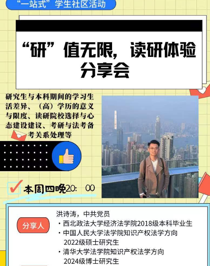 5月23日晚上,本科生第二党支部采用线上方式组织开展了一场别开生面的法学读研分享会。本次分享会邀请了公司2018级本科生,2022年推免至中国人民大学,现在清华大学攻读法学博士学位的洪诗涛同学分享读研体验,近百名在校本科生参加。