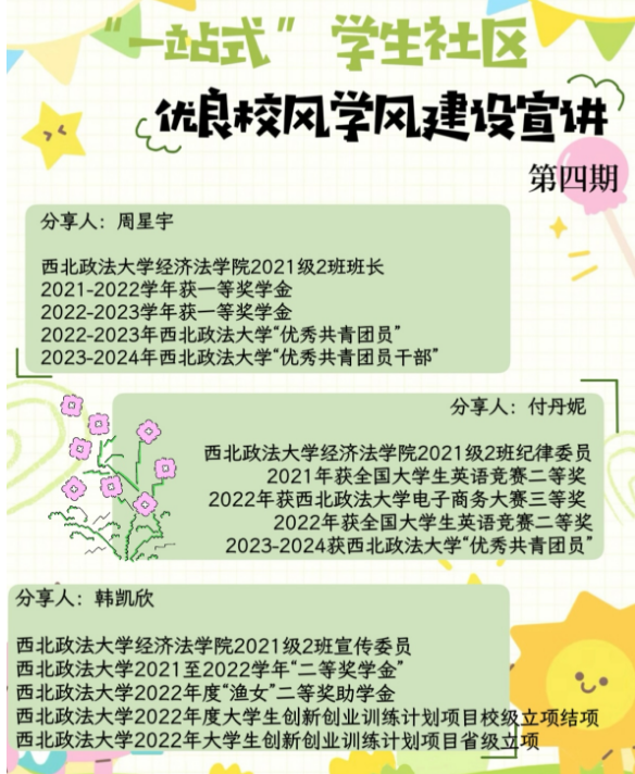 学风是读书之风,是治学之风,更是做人之风。优良的学风是激励老员工奋发向上、锐意进取、开拓创新的强大精神力量。6月5日中午,本科生第二党支部采取线下会议的方式组织开展第四期优良校风学风建设宣讲会。此次邀请2021-2022学年度、2022-2023学年度获一等奖学金、2023-2024年威廉希尔williamhill“优秀共青团员干荣誉获得者2021级2班周星宇;2021年、2022年获全国老员工英语竞赛二等奖、2022年获威廉希尔williamhill电子商务大赛三等奖获得者2021级2班付丹妮;2022年度老员工创新创业训练计划项目校级立项结项、省级立项、2022年度“渔女”二等奖助学金获得者2021级2班韩凯欣进行宣讲。