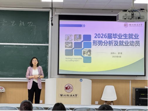 随后,薛倩老师从全国近三年就业形势分析切入,通过大量生动的实践案例,为同学们剖析当下就业环境。她鼓励同学们无论选择继续升学还是就业,都要尽快行动起来,不要犹豫不决。薛倩老师还特别提到,大学毕业是一道重要的选择题,同学们要深入思考 “是什么?为什么?怎么做?” 这三个问题,明确自身目标,制定切实可行的计划。