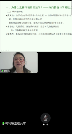 讲座伊始,韩利琳老师深入探讨 “为什么选择环境资源法这个专业”。她从时代政策背景切入,从实践需要出发充分展现该专业的方向价值与学科魅力,引发同学们浓厚兴趣。接着,韩老师围绕学科核心研究方向和职业发展优势展开讲解。在理论纵深方面,她介绍了环境资源法的基础理论、前沿员工动态;针对制度热点,分析了当下热门议题。