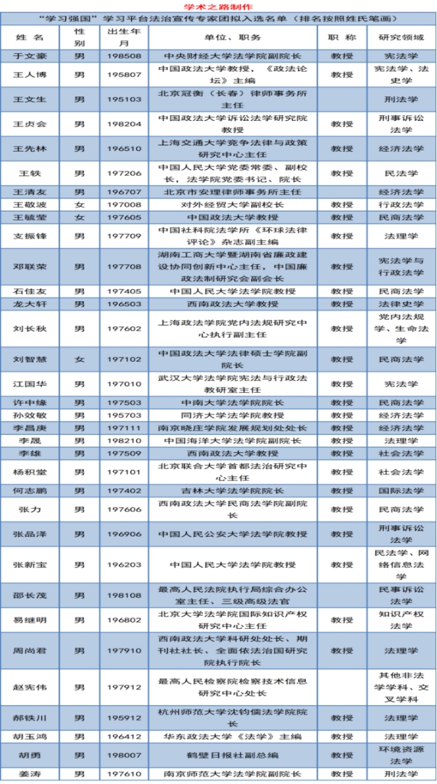 为深入学习宣传贯彻习近平法治思想,中宣部“学习强国”学习平台和中国法学会《民主与法制》社于今年4月起通过网络公开征集,经初审、复审、政审及公示环节,遴选确定了首批“学习强国”学习平台法治宣传专家团成员。