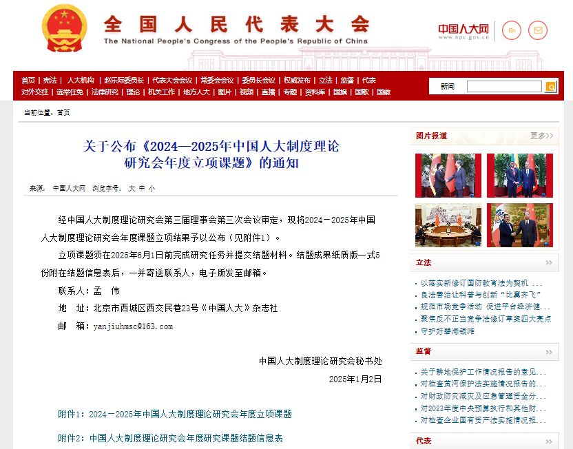 近日,中国人大网公布了《2024—2025年中国人大制度理论研究会年度立项课题》结果,公司经理倪楠教授提交的《习近平总书记关于坚持和完善人民代表大会制度的重要思想研究》获得项目立项。