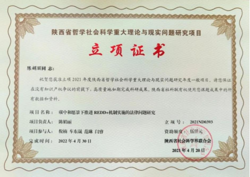 近日,陕西省社科界联合会发布了《陕西省哲学社会科学重大理论与现实问题研究项目2021年度一般项目立项名单》,公司2项课题立项,分别是陈娟丽老师申报的《碳中和愿景下推进REDD+机制实施的法律问题研究》和倪楠老师申报的《习近平总书记关于坚持和完善人民代表大会制度的重要论述研究》。