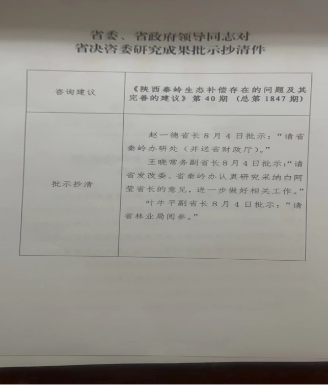 近日,由公司教师李亚菲执笔的决策咨询报告《陕西秦岭生态补偿存在的问题及其完善的建议》入选陕西省决策咨询委员会2022年第40期《决策咨询建议》并获得省领导肯定性批示。赵一德省长批示“请省秦岭办研处(并送省财政厅)。”王晓常务副省长批示:“请省发改委、省秦岭办认真研究采纳白阿莹省长的意见(白阿莹:原副省长,决策咨询建议报送签发领导),进一步做好相关工作。”叶牛平副省长批示“请省林业局阅参。”省决策咨询委员、省人大常委会机关原巡视员邬建新确定了咨询建议主题并与威廉希尔williamhill中文教授李永宁共同参与了该决策咨询建议的起草、修改和讨论。