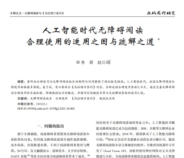 鲁甜 赵江琦:人工智能时代无障碍阅读合理使用的适用之困与疏解之道